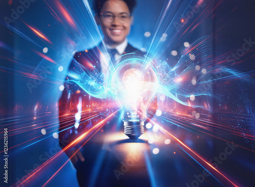 Abstract sci-fi double exposure image. A blurred figure holds a glowing lightbulb, surrounded by dynamic energy streaks against a dark background. The scene evokes innovation and futuristic ideas.