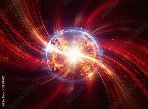 Abstract sci-fi double exposure image. A glowing earth at the center is surrounded by swirling red and orange energy streams against a dark background. The effect is dynamic and energetic.
