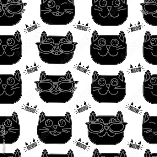 Abstract seamless cats pattern on white background with monochrome face. Cute childish repeated backdrop for child, wrapping paper. pet and dots wallpaper. Set of colorful cats faces with glass