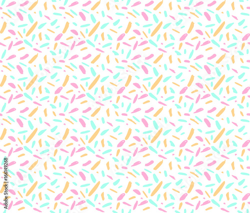 Abstract seamless ditsy pattern with pink, blue and yellow random spots and marks on white background.