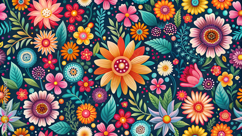 Abstract seamless floral pattern with vibrant blooming flowers and whimsical fantasy elements, floral, fantasy, textile