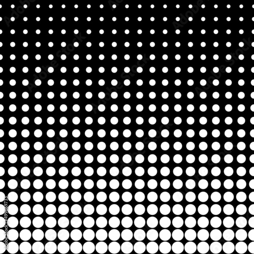 Abstract seamless geometric circle pattern. Mosaic background of white circles. Evenly spaced shapes of different sizes. Vector illustration on black background