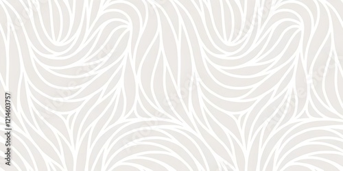 Abstract seamless pattern with flowing white curved lines on a light gray background, resembling interlocking feathers or leaves, modern minimalist design.