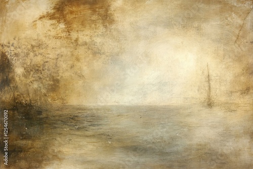 Abstract seascape painting with textured background, showing a sailboat at sunset.