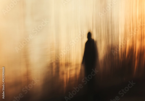 abstract shadow cast by the figure, with light beams and soft tones creating depth and texture