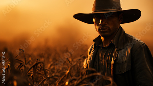 Abstract shapes forming the image of a cowboy against a setting sun.