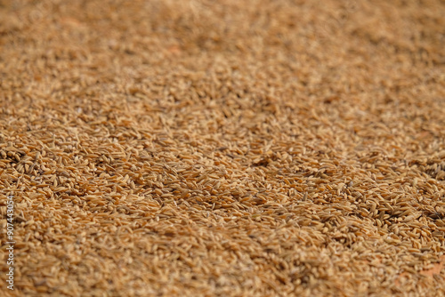 Abstract shapes, patterns, textures of rice seeds dried in the sun. Drying rice seeds before processing. Abstract shapes, patterns and textures of brown rice seeds for graphic design