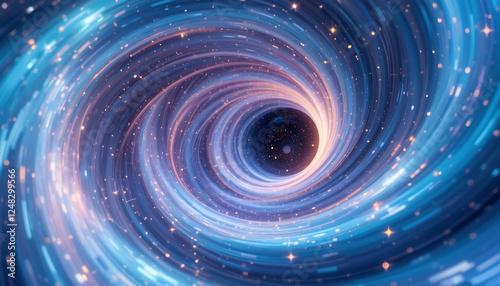 Abstract shimmering spinning vortex style background in blue,purple, and aqua gradient, twisted, , maintains golden ratio, burning and glowing stars, depicting quantum physics, minimalist style, hole