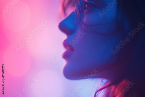 Abstract Silhouette: A side profile of a person's face is bathed in an alluring blend of blue and pink hues, creating a mesmerizing atmosphere with out-of-focus bokeh lights.