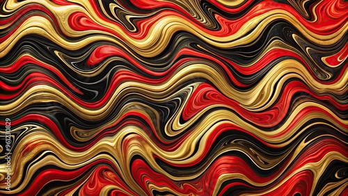 Abstract silhouette acrylic paint design in red, black, and gold waves