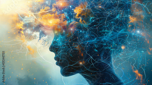 Abstract Silhouette of Human Head with Neural Connections, Vivid Colors and Cosmic Energy, Representing Mental World, Imagination, and Consciousness