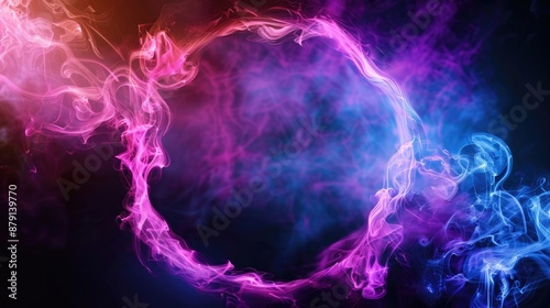 Abstract smoke in dark circular frame with colorful mist and occult energy explosion