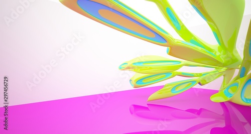 Abstract smooth architectural white interior with color gradient of a minimalist house with large windows. 3D illustration and rendering.