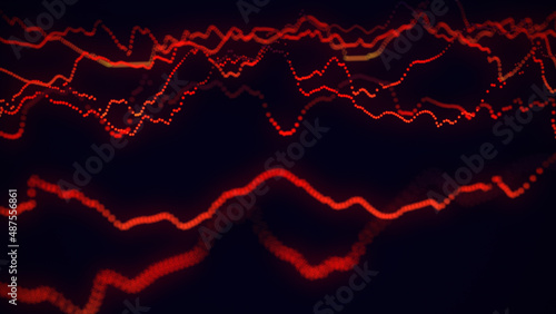 Abstract smooth red dynamic music wave with dots. Audio digital equalizer technology. Glowing electric waves on dark background. 3d rendering