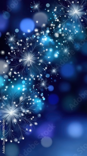 Abstract Snowflake Patterns and Festive Light Bokeh on a Dark Blue Background