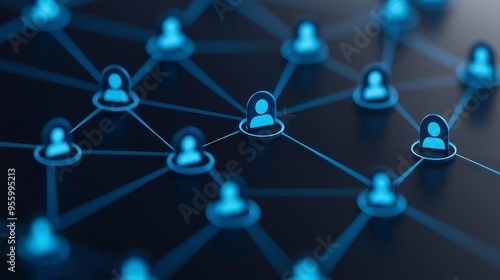 Abstract social network illustration with blue user icons linked by digital connections on a dark background