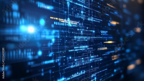 Abstract software technology background featuring dynamic geometric shapes, digital data flow, and futuristic network connections in blue and orange colors, representing innovation and advanced connec