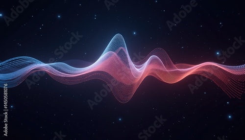 Abstract sound wave visualization with flowing lines and glowing particles in blue and red tones against dark background