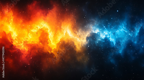 Abstract space background with fire and ice nebulae forming a galactic collision of color
