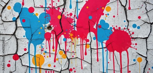 Abstract spray paint drips and splatters on a heavily cracked, textured wall , composition, vandalism
