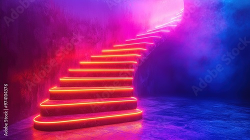 Abstract staircase made of bright neon lines leading upward, representing creative business success, climbing to success, innovation in business