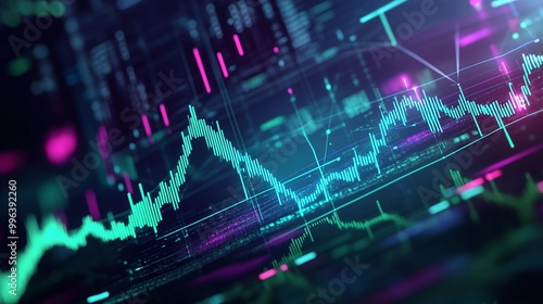 Abstract stock market graph with colorful data lines and glowing elements on a dark background.