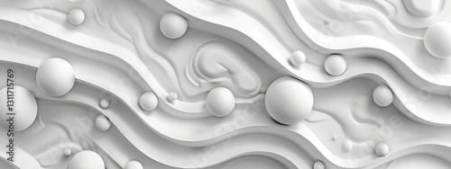 Abstract swirl bas-relief curve wave white wall and round sphere shapes close up shot.