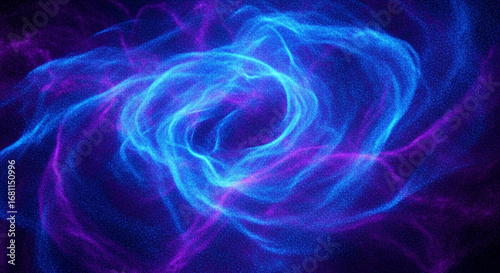 Abstract swirling blue and purple light particles on dark background create dynamic energy flow, symbolizing cosmic energy or digital innovation