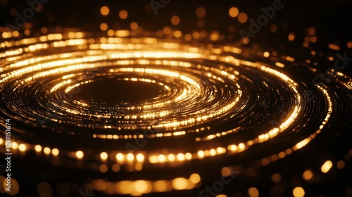Abstract swirling golden light circles on black background.