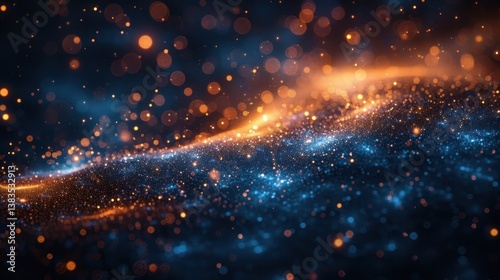 Abstract swirling particles, dark background, glowing light, digital art