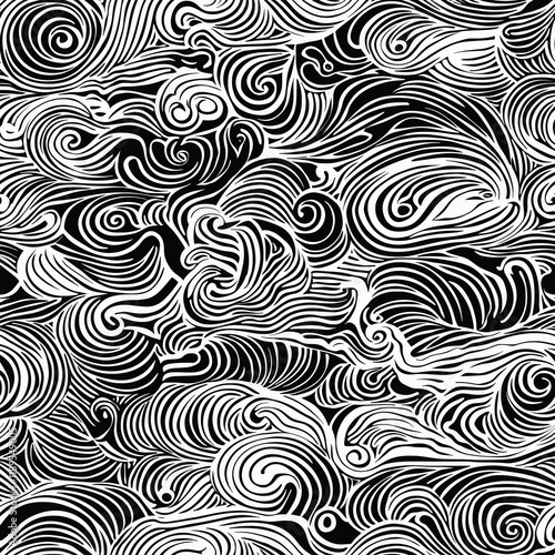 Abstract swirling patterns in black and white, creating a dynamic and textured appearance reminiscent of waves or smoke.