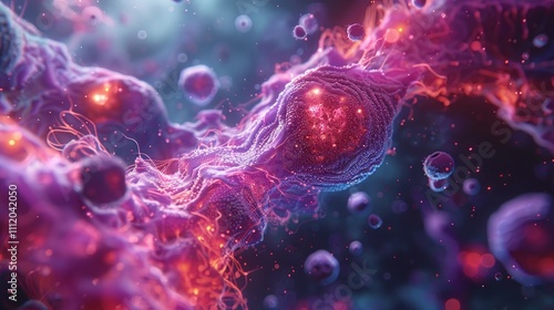 Abstract swirling purple and red glowing spheres with sparks. AI generative. .