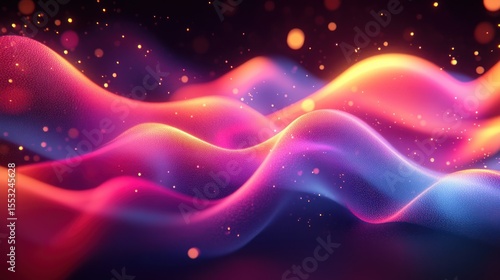 Abstract swirling ribbons in vibrant colors, dotted with glowing particles