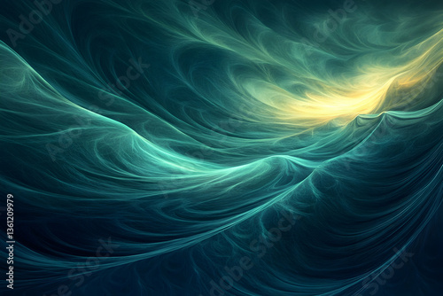 Abstract teal waves of luminous smoke swirl with a golden glow, forming fluid motion and depth, evoking energy, mystery, and cinematic atmosphere.