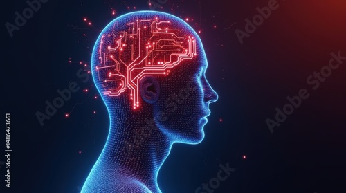 Abstract technological representation of human mind with glowing circuit patterns. Head silhouette containing illuminated data pathways symbolizing artificial intelligence processing.