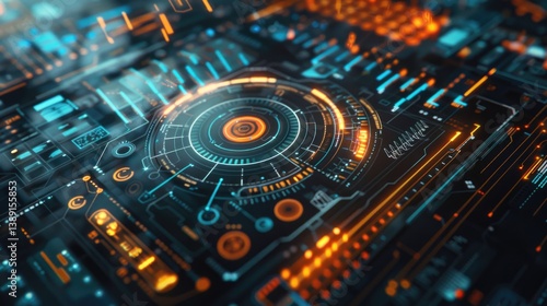 abstract technology background, electronic circuit board with processor, fiber optics background with many light spots