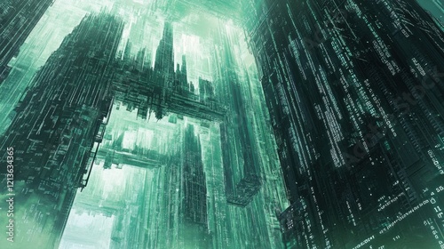 abstract technology background features a mesmerizing cityscape created from binary code, with streams of ones and zeros intertwining to form skyscrapers, roads, and bridges, evoking a futuristic
