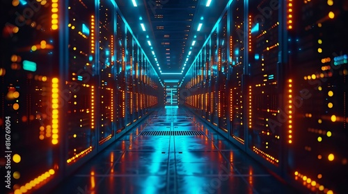 Abstract technology background. Server room with rows of rack-mounted servers lit by bright blue and orange lights.