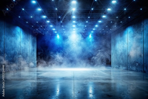 Abstract Technology Background with Bokeh Effect, Dark Blue Cement Floor, Studio Room with Smoke, Spotlights, Laser Light, Digital Future Concept, Modern Interior Design