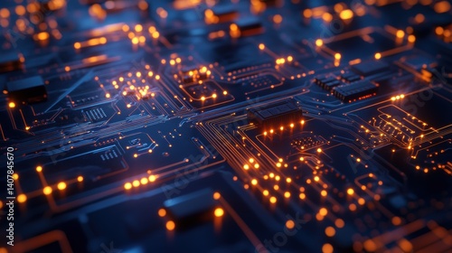Abstract Technology Background with Circuit Board and Glowing Orange Lights on Dark Surface for Modern Digital Aesthetic