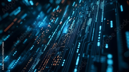 Abstract technology chip lines growing from bottom to top at digital binary code background.