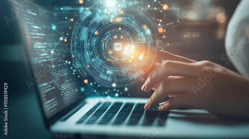 abstract technology cyber security with fingerprint and circle digital consist: hands hi tech blue future on hi tech dark blue futuristic background