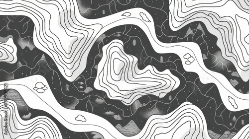 Abstract topographic lines with nature and animal icons in a monochrome palette