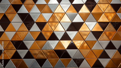 Abstract triangular mosaic tile wallpaper texture with geometric fluted triangles of metallic gold silver copper background banner, Generative Ai