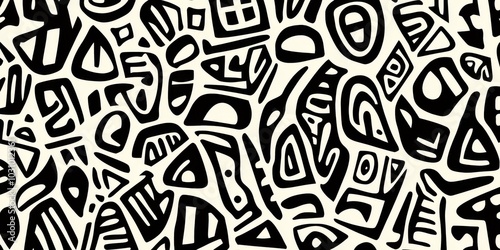 Abstract tribal print featuring intricate black and white digital ink drawings.