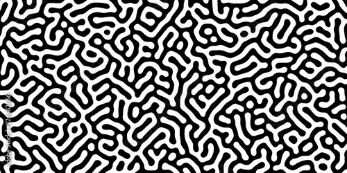 Abstract Turing organic wallpaper with background. Turing reaction diffusion monochrome seamless pattern with chaotic motion. Natural seamless line pattern. Linear design with biological shapes.