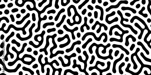 Abstract Turing organic wallpaper with background. Turing reaction diffusion monochrome seamless pattern with chaotic motion. Natural seamless line pattern. Linear design with biological shapes.
