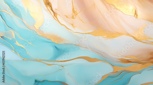 Abstract turquoise marble texture with golden lines on glossy surface for background or wallpaper presentation. Aspect ratio 16:9