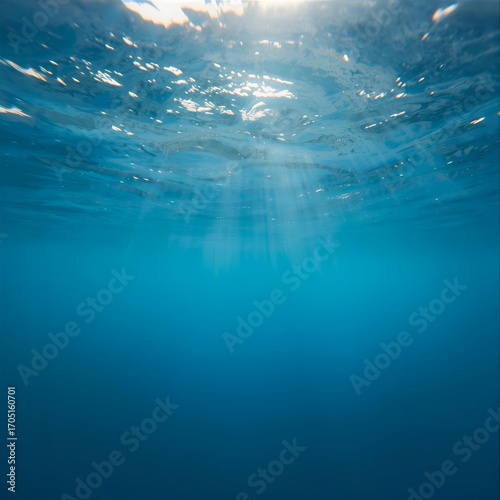 Abstract underwater light rays passing through crystal-clear ocean water, soft gradients of blue and turquoise, dreamy atmosphere