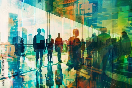 Abstract Urban Business Scene with Silhouettes and Reflections in a Modern Glass Building Overlooking a Cityscape